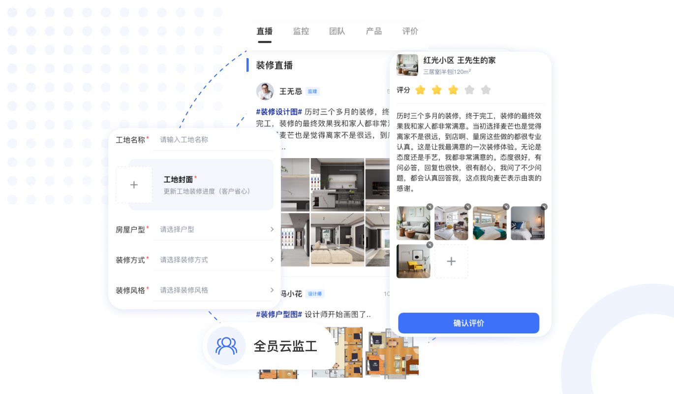 工地實時監(jiān)控直播,業(yè)主足不出戶,實時觀看裝修現(xiàn)場,工地圖文,視頻,VR全景實時更新,保證裝修進度。